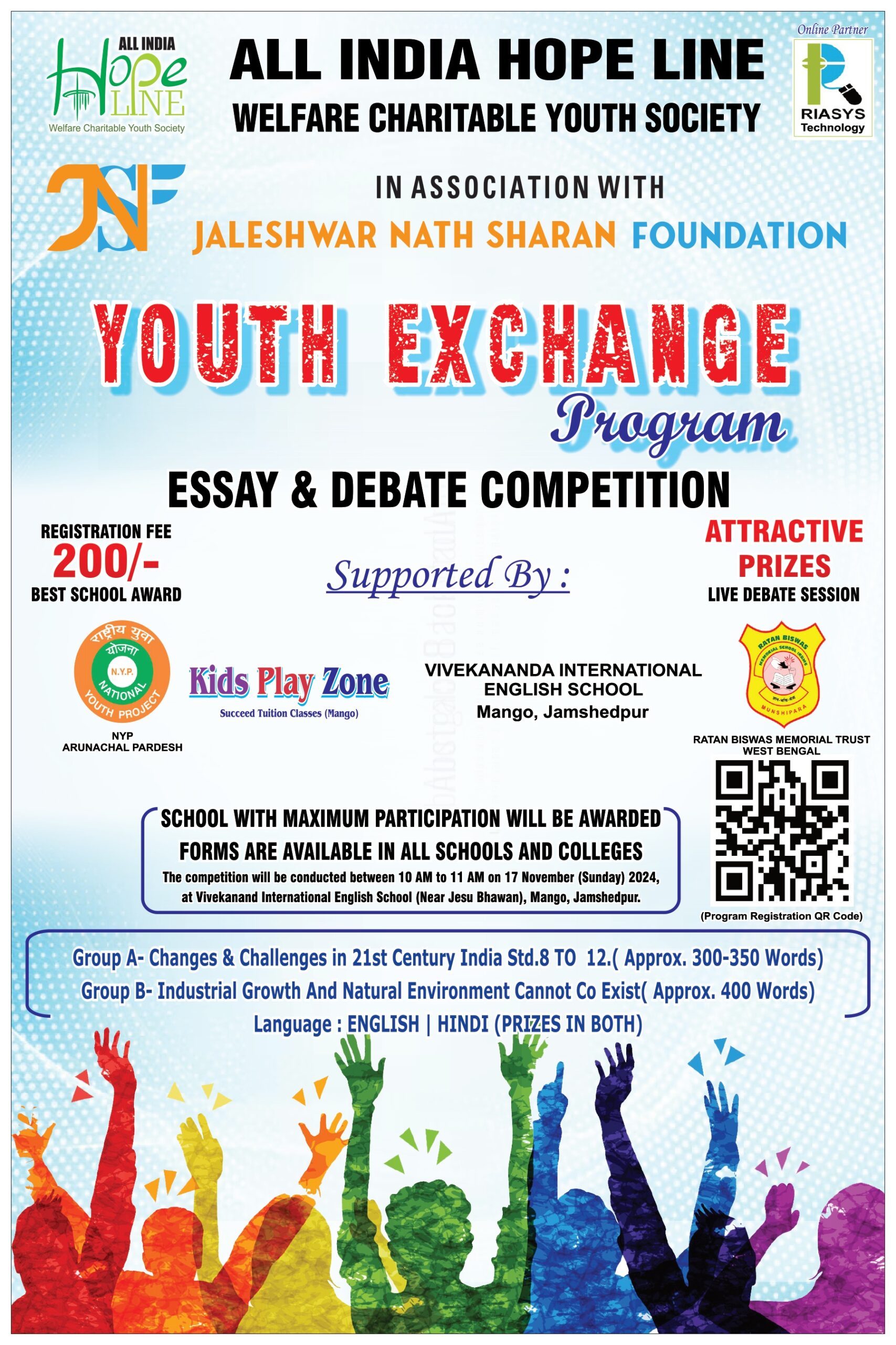 The competition will be conducted on 1st December 2024 . On the spot Registrations will also be done in case you have not registered yourself for the competition. Reporting time is 8:30 AM at Vivekananda International English School , Mango , Near Jesu Bhavan .